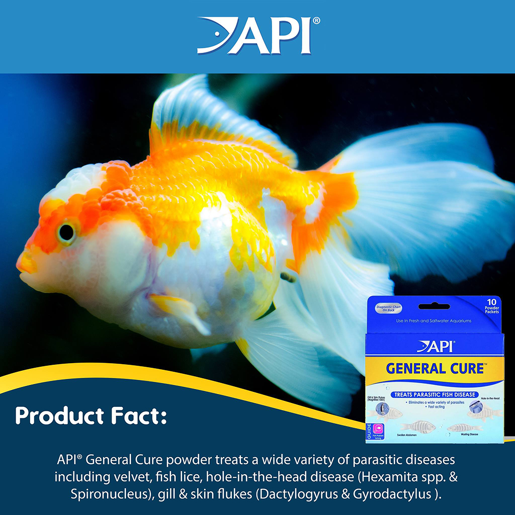 API - General Cure hỗ trợ xử lý rất hiệu quả nhiều loại bệnh do ký sinh trùng của cá cảnh như nấm bông, sợi trắng, rận cá, sán, giun lá (Dactylogyrus & Gyrodactylus), bệnh lỗ đầu (Hexamita spp. & Spironucleus), bể bong bóng, trương nội tạng, sình bụng nhẹ, tổn thương cơ quan bên trong cơ thể.