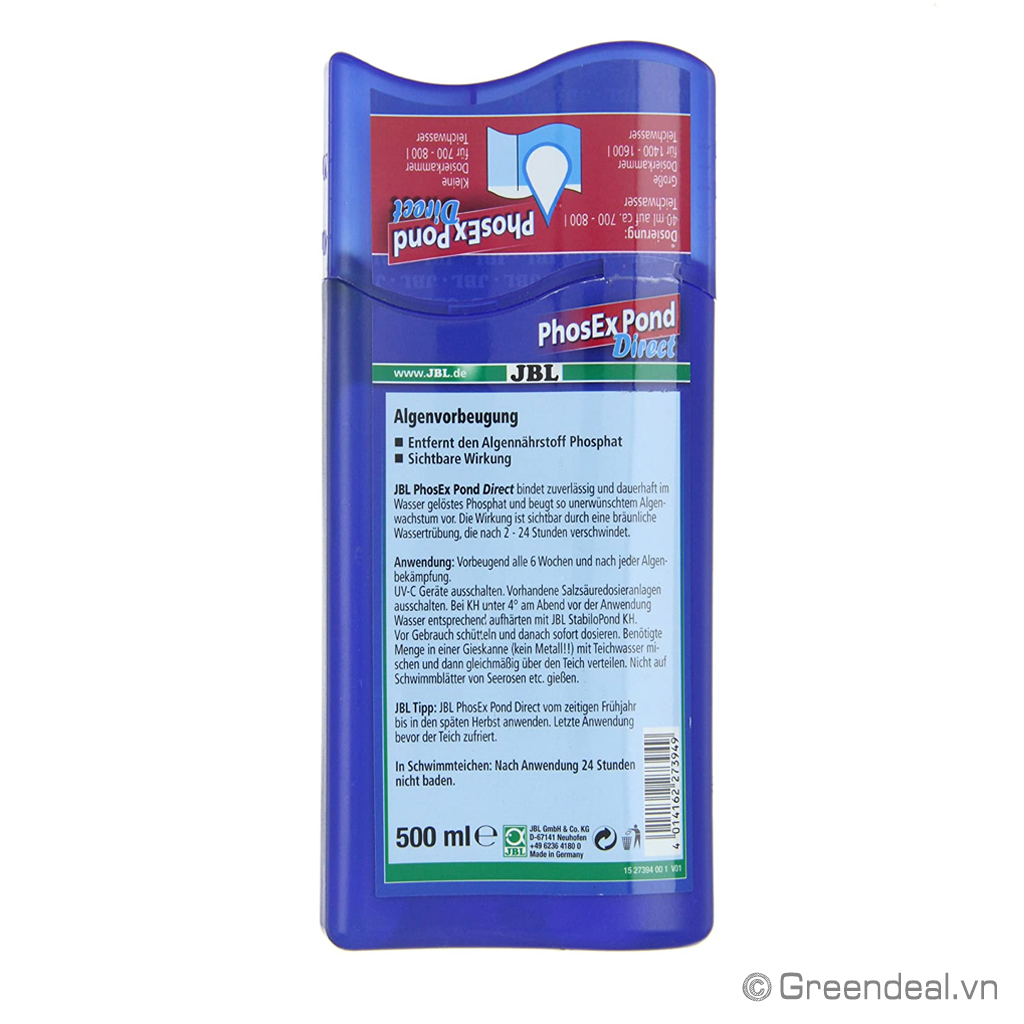JBL - PhosEx Pond Direct giúp loại bỏ các nguồn dinh dưỡng thừa, Phosphate (PO4). Ngăn ngừ các loại rêu, tảo hại phát triển trong hồ cá Koi.