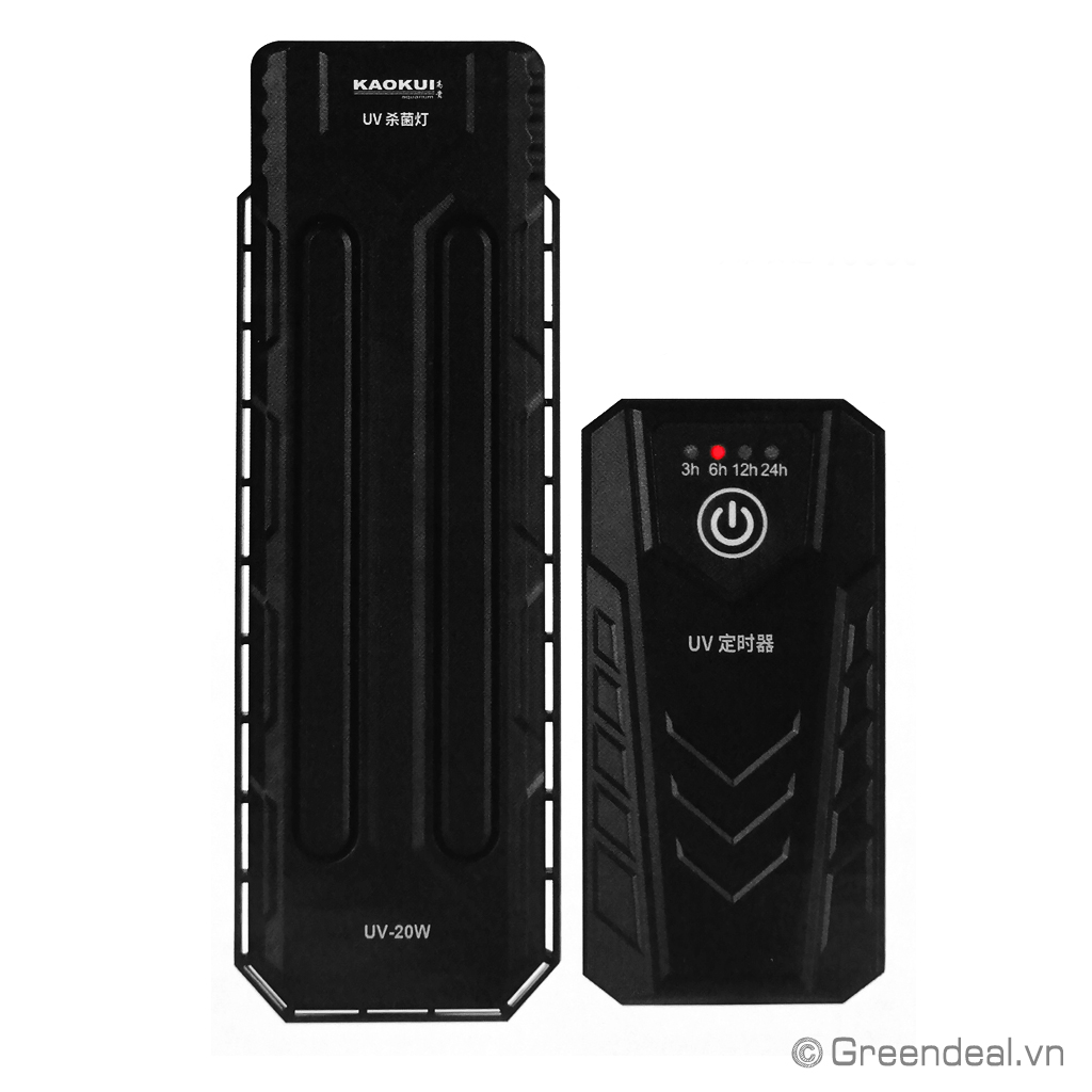 KAOKUI - Intelligent Timing Sterilization Lamp dòng đèn UV điện tử lắp chìm trong ngăn lọc hoặc trong nước hồ cá thủy sinh. Đèn được trang bị vỏ bọc bảo vệ tránh ánh sáng của tia UV ảnh hưởng mắt người dùng và tích hợp thêm tính năng hẹn giờ thông minh tự động bật/tắt theo chu kỳ 3/6/12/24 giờ, đồng thời bảng điều khiển đặt bên ngoài hồ giúp dễ dàng thao tác cài đặt.