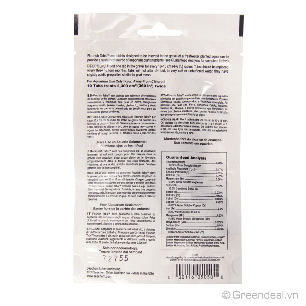 SEACHEM - Flourish Tabs có dạng viên nén, giúp kích thích sinh trưởng cho bộ rễ của cây thủy sinh. Flourish Tabs chứa các nguyên tố vi lượng, axit amin và vitamin thiết yếu. Flourish Tabs rất giàu sắt, mangan, magiê, canxi, kali, inositol, choline B12, biotin và các yếu tố khác có lợi cho rễ cây thủy sinh. Flourish Tabs không chứa photphat hoặc nitrat nên không thúc đẩy sự phát triển của tảo.