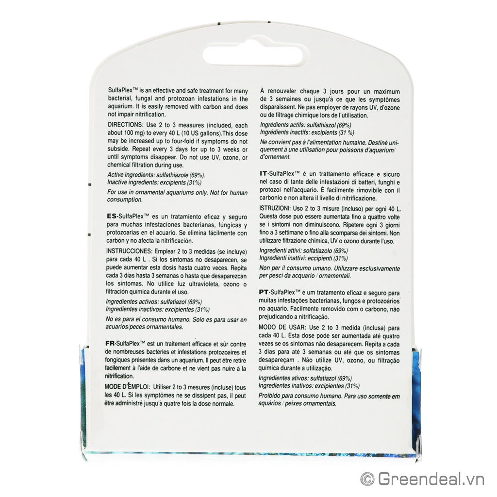 SEACHEM - SulfaPlex có thành phần hoạt chất là thuốc kháng sinh Sulfathiazole (69%) và thuốc chống nấm phổ rộng, được xem là phương pháp điều trị hiệu quả và an toàn với nhiều loại nhiễm khuẩn, nấm và động vật nguyên sinh trong hồ cá. Mặc dù có thể sử dụng trong cả nước ngọt cũng như nước mặn, nhưng SulfaPlex đặc biệt hiệu quả đối với các bệnh nhiễm khuẩn và nấm phổ biến ở cá cảnh nước ngọt.