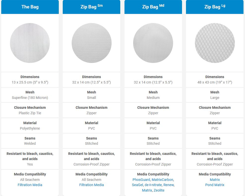 SEACHEM - Zip Bag có kích thước 32 x 14 (cm) và mắt lưới phù hợp sử dụng cho các loại vật liệu lọc có kích thước từ trung bình đến lớn như SEACHEM - PhosGuard, SEACHEM - PhosBond, SEACHEM - SeaGel, SEACHEM - Matrix Carbon, SEACHEM - Matrix, SEACHEM - Pond Matrix, SEACHEM - HyperSorb, SEACHEM - Zeolite, SEACHEM - Renew, HYDOR - Zeolite ......