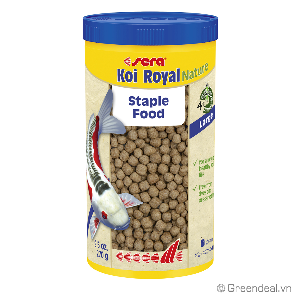 SERA - Koi Royal Nature (Large) là dòng sản phẩm thức ăn cám tăng trọng dành cho cá Koi dạng hạt có kích thước 6 mm/0,2 in, được sản xuất theo tiêu chuẩn không sử dụng thuốc nhuộm và chất bảo quản.