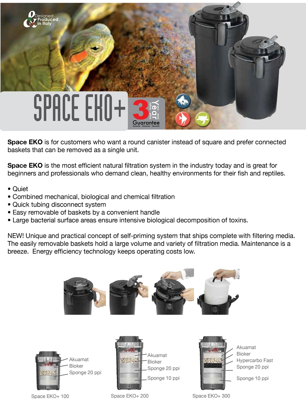 SICCE - External Filter Space Eko+ 100 là bộ lọc ngoài cho hồ thủy sinh được thiết kế và sản xuất tại Ý theo công nghệ tiên tiến, cải tiến mô tơ máy bơm giúp tiết kiện điện năng so với bộ lọc cùng loại.