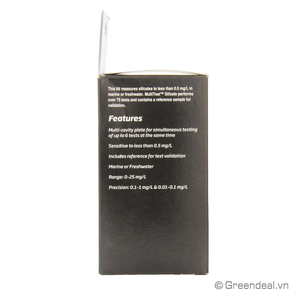 SEACHEM - MultiTest: Silicate là bộ dung dịch đặc biệt có thể kiểm tra nồng độ Silicat thấp dưới 0,5 mg/L trong nước mặn hoặc nước ngọt. Bộ dụng cụ này đo silicat hòa tan và chỉ thị nồng độ Silicat bằng màu, nếu chuyển đổi sang Silic, nhân với 0,3 để ra thông số. SEACHEM - MultiTest: Silicate có thể thực hiện được hơn 75 lần thử nghiệm và chứa một mẫu thử để tham chiếu.