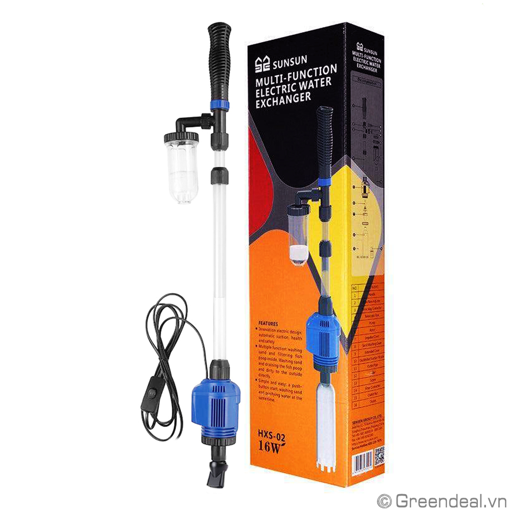 SUNSUN - Multifunction Electric Water Exchanger (HXS-02) là dòng máy hút cặn vệ sinh hồ cá đa năng chạy điện, có công dụng hút cặn bẩn dưới đáy hồ ở mọi ngóc ngách, sục đất nền để hút cặn bẩn ra ngoài, dùng như 1 chiếc máy bơm thay nước cho hồ cá… Giờ đây việc thay nước bể cá hay lọc bẩn thật đơn giản với bộ sản phẩm này.